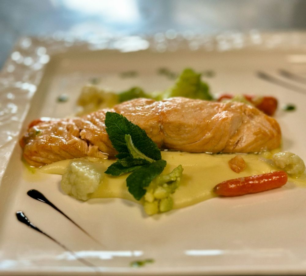 Trancio di Salmone con verdurine croccanti su vellutata di patate